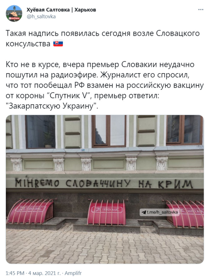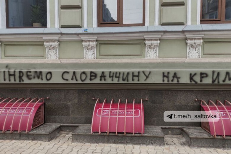 На здании Почетного консульства Словацкой Республики в Харькове после скандала из-за шутки словацкого премьера появилась надпись "Меняем Словакию на Крым".
