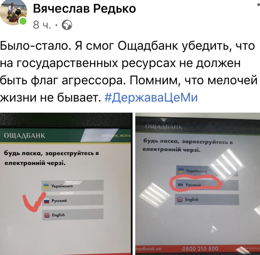 "Я сторонник того, чтобы русский язык присутствовал на ресурсах, на сайтах коммерческих компаний, государственных, городских, областных администраций. Для того, чтобы могли читать те, кому не комфортно по разным причинам. Для тех, кто, может, из Сибири захочет узнать объективную информацию о городе или области, или стране, или работе министерства, мы должны быть доступны. Но там не должно быть российской символики. При этой символике я видел, как рушился Донбасс, как рушился Крым – я не могу быть безразличным. Сегодня я проверил: Ощадбанк убрал, Приватбанк убрали российский флаг со своих терминалов. Это очень важно.", - говорит Редько.