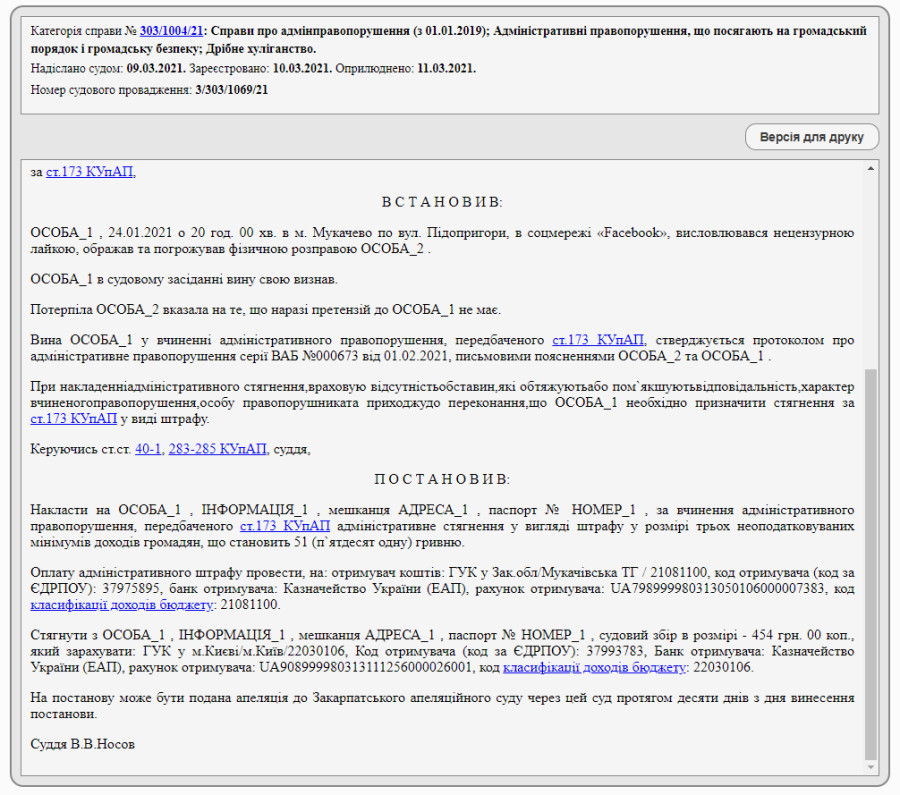 Исходя из текста приговора, на жителя Мукачево заявление написала женщина. Оказалось, что будучи у себя дома, он обзывал потерпевшую нецензурными словами в сети и угрожал расправой.