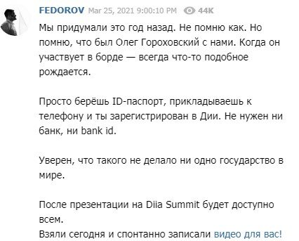 «Мы придумали это год назад. Не помню как. Но помню, что был Олег Гороховский с нами. Когда он участвует в борде — всегда что-то подобное рождается. Просто берёшь ID-паспорт, прикладываешь к телефону и ты зарегистрирован в Дии. Не нужен ни банк, ни bank id. Уверен, что такого не делало ни одно государство в мире», - рассказал Федоров.