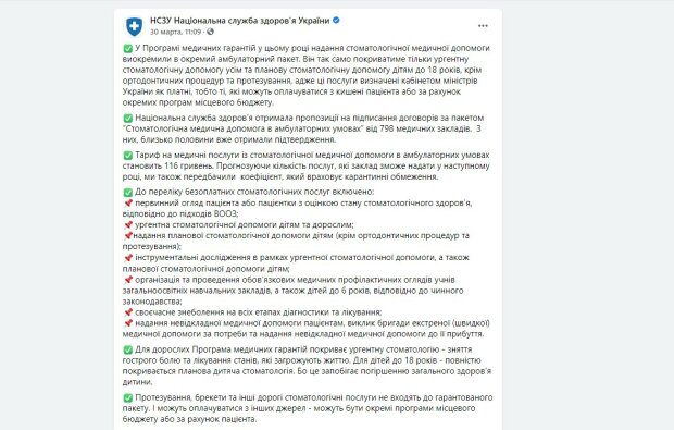 Он так же будет покрывать только ургентную стоматологическую помощь всем и плановую стоматологическую помощь детям до 18 лет, кроме ортодонтических процедур и протезирования, сообщает НСЗУ в Фейсбук.