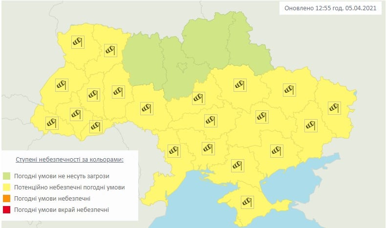 Согласно опубликованной карте, погодные условия будут опасными по всей стране, кроме Житомирской, Киевской, Черниговской и Сумской областей.