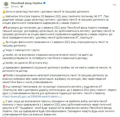В соответствие с постановлением, до 1 сентября 2021 Пенсионный фонд Украины проведет первый конкурс для отбора организаций, осуществляющих выплату и доставку пенсий и денежной помощи по месту фактического проживания получателей в пределах Украины. В его проведения выплату и доставку пенсий будет осуществлять АО "Укрпочта".