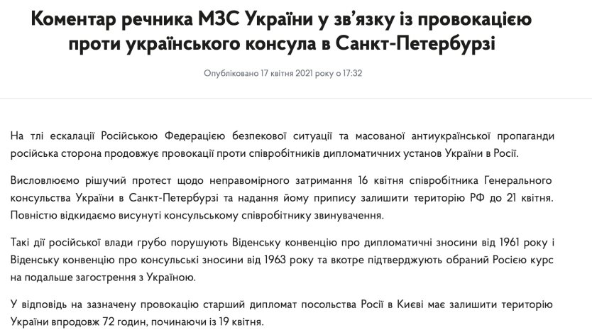 В субботу, 17 апреля, разгорелся громкий скандал из-за задержания в Санкт-Петербурге украинского консула Александра Сосонюка Федеральной службой безопасности РФ. Также в российском МИД приняли решение, что украинский дипломат должен покинуть страну в течение 72 часов. Украина ответила на провокационные действия России.