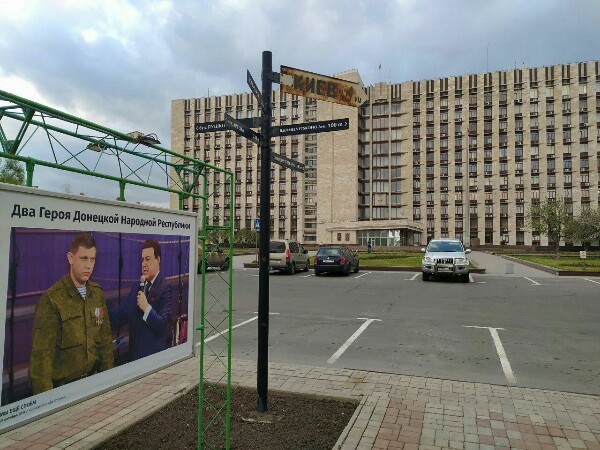 Столб с указанием «Киев 770 км» стоит в центре города, у здания Донецкого областного совета.