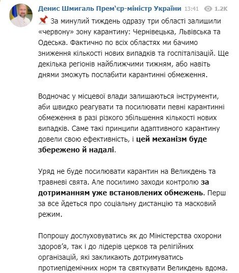 Кроме того, премьер призвал украинцев прислушиваться как к Министерству здравоохранения Украины, так и к лидерам церквей и религиозных организаций, призывающих соблюдать санитарные нормы и праздновать Пасху дома.