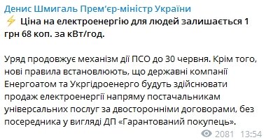 "Правительство продолжает механизм действия ПСО до 30 июня. Кроме того, новые правила устанавливают, что государственные компании Энергоатом и Укргидроэнерго будут осуществлять продажу электроэнергии напрямую поставщикам универсальных услуг по двусторонним договорам, без посредника в виде ГП "Гарантированный покупатель", — написал он.