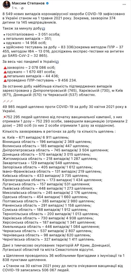 За время существования вакцинальной кампании от коронавируса в Украине было привито 752 295 человек, из них 49 985 - только за минувшие сутки. Также по состоянию на 1 мая завершили вакцинация, а значит, получили уже вторую дозу вакцины, 260 человек.