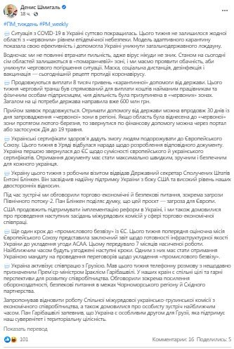 "Прием заявок продолжается. Получить помощь от государства можно в течение 30 дней со дня введения «красной» зоны в регионе. Если область была отнесена к «красной» зоне в течение февраля-марта, то обратиться за финансовой помощью можно через портал или приложение Дия до 19 мая ", - написал Шмыгаль.