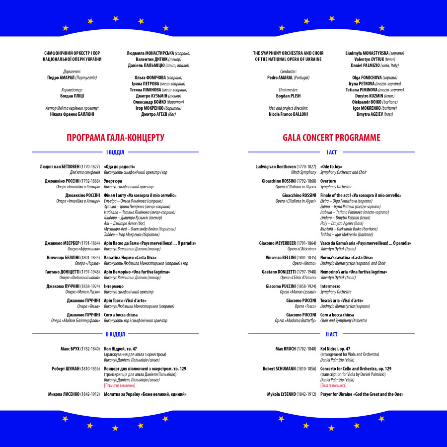 У проекті, що має семирічну історію (автор ідеї та керівник проекту – професор Нікола Франко Баллоні, відомий організатор масштабних міжнародних культурних ініціатив в Україні), традиційно беруть участь італійські та українські зірки музичного мистецтва, а також митці країни, яка головує в Раді Європейського Союзу. Цьогоріч – це Португалія. Тож на головній оперній сцені країни виступатимуть солісти Національної опери України, зокрема, одна з найкращих сопрано світу Людмила Монастирська та незрівняний тенор Валентин Дитюк, а також знаменитий італійський альтист Даніель Пальміціо. Виступи солістів супроводжуватиме хор (хормейстер – Богдан Пліш) і симфонічний оркестр Національної опери України під керівництвом португальського диригента Педро Амарала (головного диригента та художнього керівника Лісабонського оркестру «Metropolitana»). У програмі – перлини європейської класичної музики – твори Л. ван Бетховена, Дж. Россіні, Дж. Меєрбера, В. Белліні, Г. Доніцетті, Дж. Пуччіні, М. Бруха та М. Лисенка, а також прем’єрне виконання Концерту для віолончелі з оркестром (тв.129) Р. Шумана у транскрипції для альта Даніеля Пальміціо.
