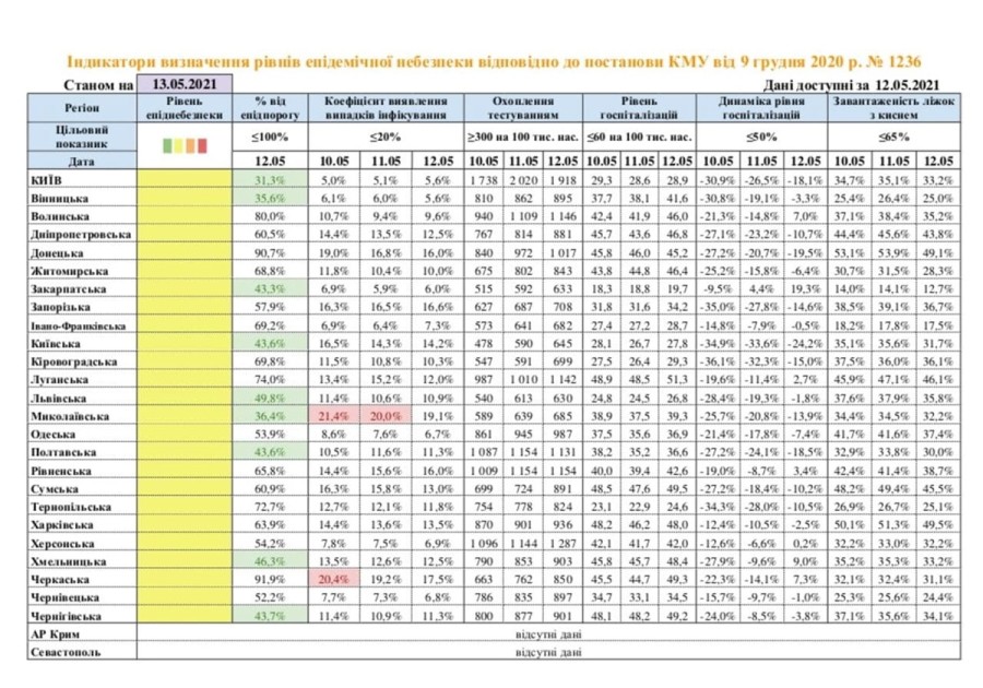 При этом девять регионов соответствуют зеленой зоне по проценту от эпидемического порога: Киев, Волынская, Закарпатская, Киевская, Львовская, Николаевская, Полтавская, Хмельницкая и Черниговская область.