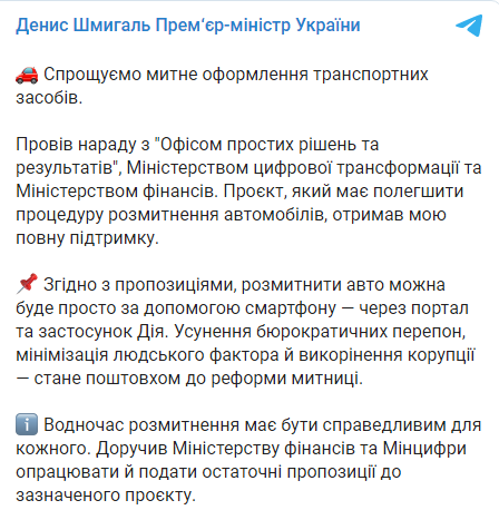 Также Шмыгаль написал, что после запуска этой технической возможности правительство займется реформой таможни.