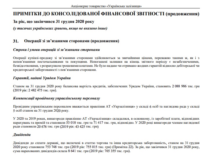 В 2020 и 2019 годах вознаграждения правлению АО "Укрзализныця" состояли в основном из заработной платы, соответствующих начислений и премий и составляли 53 018 000 грн и 71 417 000 грн соответственно. В 2020 году вознаграждения членам наблюдательного совета составили 20 676 000 грн (2019 год: 43 425 000 грн), - говорится в отчете "Укрзализныци".