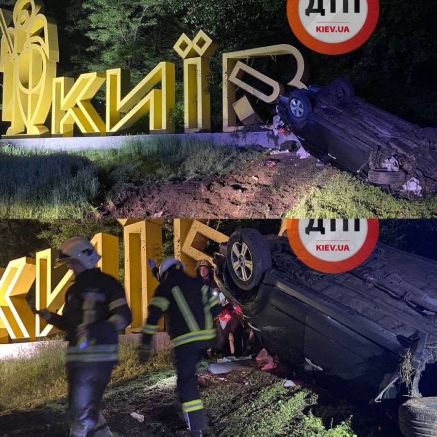 На Бориспольской трассе Subaru вылетел с дороги, перевернулся и влетел в надпись Киев. В машине был лишь водитель, его госпитализировали. Скорее всего, заснул за рулём.
