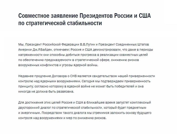 "Мы, Президент Российской Федерации В. В. Путин и Президент Соединенных Штатов Америки Дж. Р. Байден, отмечаем: Россия и США демонстрировали, что даже в периоды наряженности они способны добиться прогресса в реализации совместных целях по обеспечению предсказуемости в стратегической сфере, снижение рисков вооруженных конфликтов и угрозы ядерной войны" - говорится в сообщении.