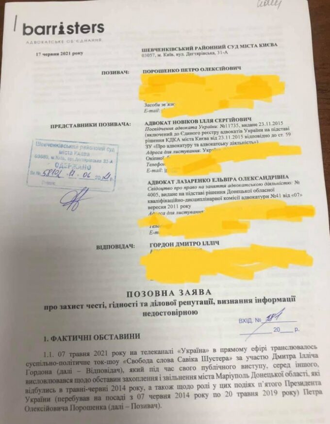 Адвокаты лидера партии "Европейская Солидарность" Петра Порошенко подали в Шевченковский районный суд Киева исковое заявление против журналиста Дмитрия Гордона, требуя признать распространенную информацию недостоверной, сообщает пресс-служба политсилы.