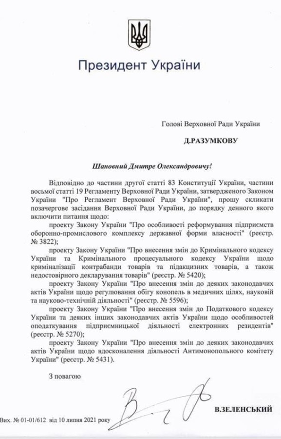 Президент Владимир Зеленский обратился к спикеру Верховной Рады Дмитрию Разумкову с просьбой собрать внеочередное заседание парламента.