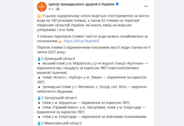 - Пляжи "Веселка", "Венеция", "Детский", "Золотой", "Молодежный", "Слободка", "Центральный", "Троещина", "Тельбин", "Радуга", "Вербное", "Пуща-Водица", "Галерный" – отклонения по индексу ЛКП
