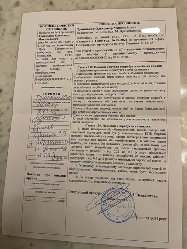Согласно документу, Тупицкого вызывают в Генпрокуратуру на пятницу 16 июля в рамках уголовного дела от 30 октября 2020 года о государственной измене.