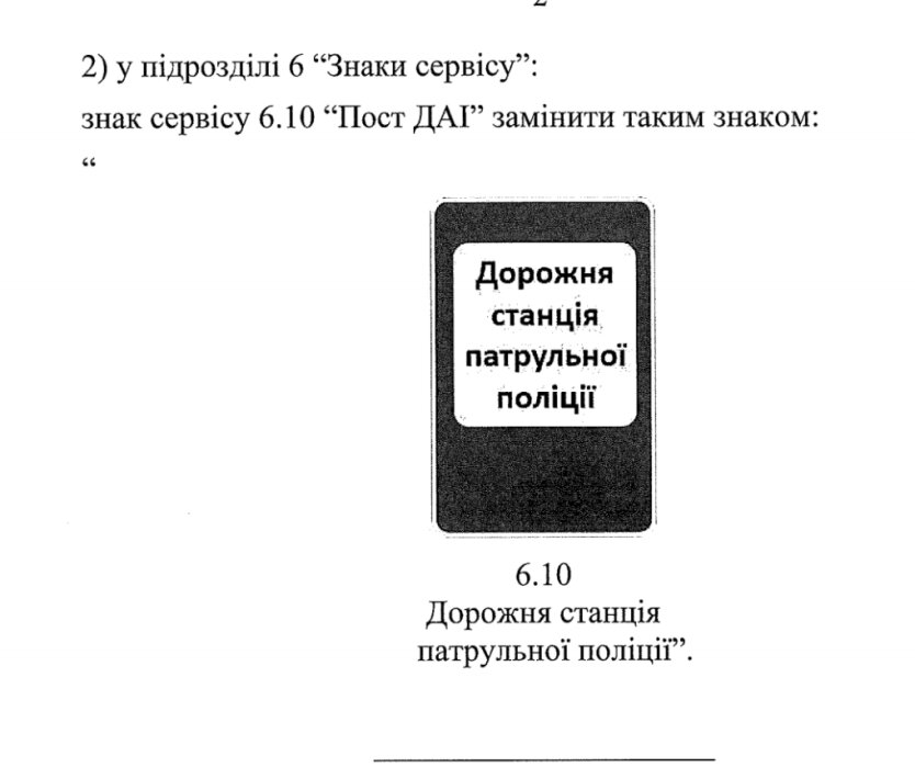 Кроме того, в Украине с 2015 года ликвидирована Государственная автоинспекция (ГАИ), а функции по контролю были возложены на Департамент патрульной полиции. В связи с этим знак "Пост ГАИ" теперь заменят на знак "Дорожная станция патрульной полиции".