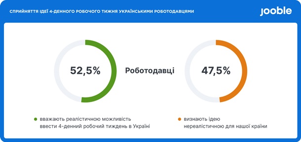 При этом 28,7% не готовы экспериментировать с изменением графика сотрудников. Однако 52,5% работодателей считают реалистичной возможность ввести четырехдневную рабочую неделю в Украине, а 47,5% признают идею нереалистичной для нашей страны.