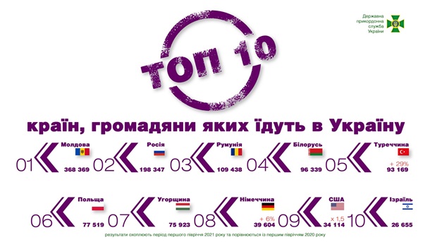 Что касается иностранцев, которые посещали Украину за первые шесть месяцев текущего года, то наибольший прирост продемонстрировала Турция (+29% к показателю аналогичного периода прошлого года). На 6% выросло количество граждан Германии. Незначительным в абсолютном количестве, но показательным по сравнению, является рост в полтора раза количества граждан США, прибывающих в Украину в первом полугодии 2021-го.