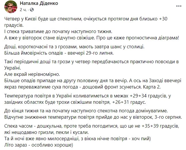 В Киеве 29 июля тоже будет жарко, днем ожидается около +30 градусов. Возможны кратковременные дожди с грозами.