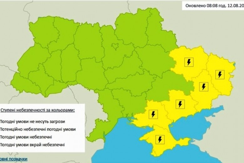 "12 августа в юго-восточной части Украины грозы, местами шквалы 15-20 м/с (І уровень опасности, желтый). 12-14 августа в восточных, Киевской, Сумской областях, 14 августа и в Полтавской областях будет преобладать чрезвычайный уровень пожарной опасности", - говорится в сообщении.
