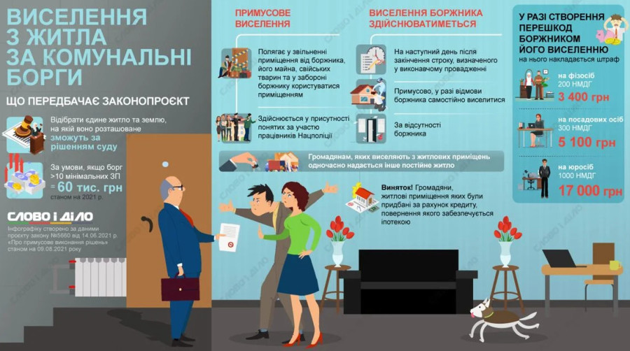 Если должник будет создавать препятствия для своего выселения, его оштрафуют. Для физических лиц штраф составит 3,4 тысячи гривен, для юридических лиц – 17 тысяч гривен, для должностных лиц – 5,1 тысячи гривен.