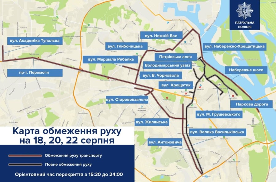Также 18, 20 и 22 августа с 15:30 до полуночи ограничат движение транспорта на улицах Льва Толстого (на участке от Терещенковской до площади Льва Толстого) и на Петра Сагайдачного (на участке от Боричева спуска к Игоревской).