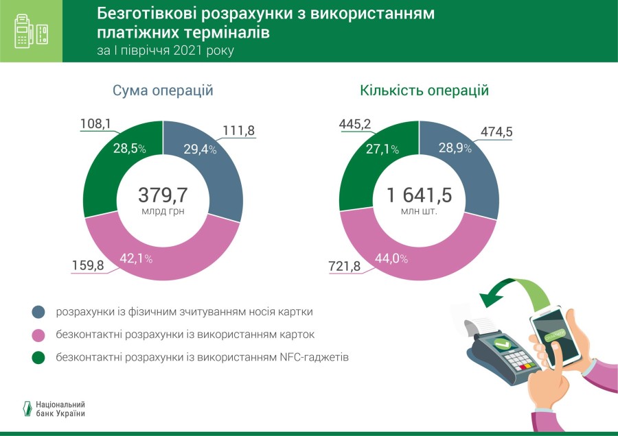 Также почти на 20% за год выросла сеть торговых pos-терминалов в Украине - до 406,4 тыс. (в первом полугодии 2020 - 340,6 тыс.). Из них около 90% торговых платежных терминалов обеспечивают возможность осуществления бесконтактной оплаты.