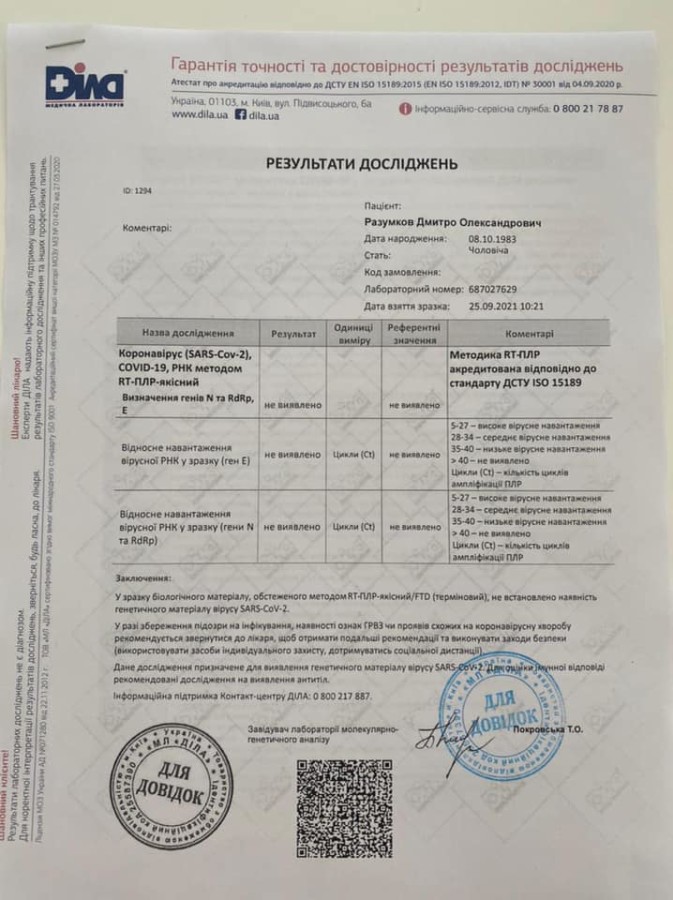 Спикер Верховной Рады Дмитрий Разумков выздоровел от коронавирусной инфекции и завтра выходит на работу. Тест с отрицательным результатом Разумков опубликовал на своей странице в Facebook .