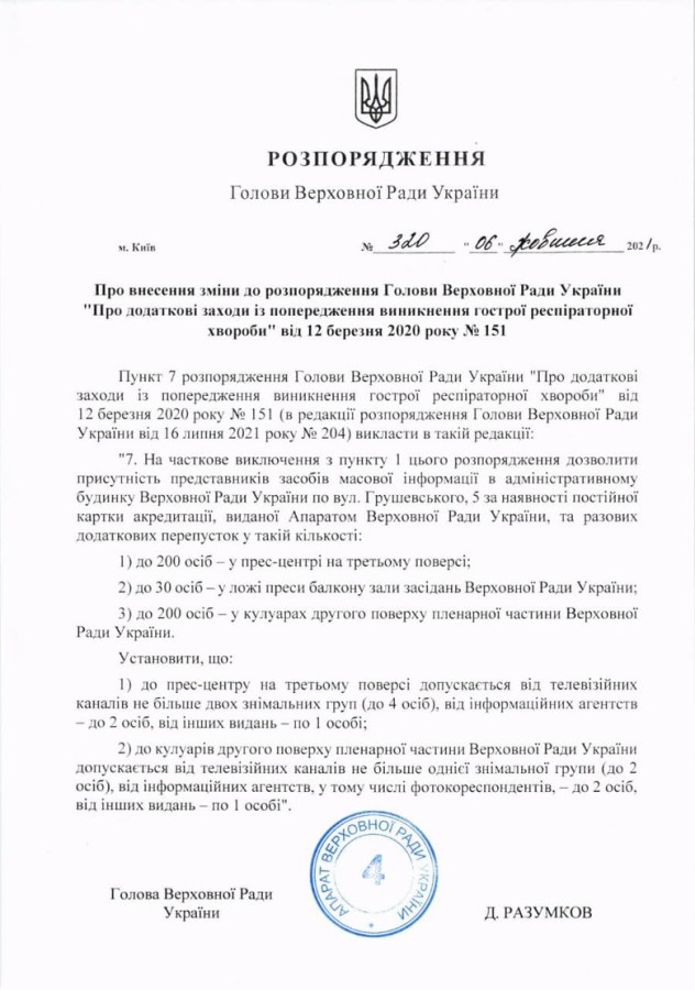 Спикер Верховной Рады Дмитрий Разумков подписал распоряжение об увеличении количества представителей СМИ, которые могут работать на втором и третьем этажах парламента.