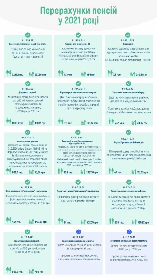 В частности, пенсии с 1 декабря повысят пенсионерам возрастом от 65 лет со стажем 35 лет для мужчин и 30 лет для женщин. Минимальная пенсия для них вырастет до 2600 гривен в связи с ростом минимальной зарплаты (с 6 тысяч до 6,5 тысяч гривен).