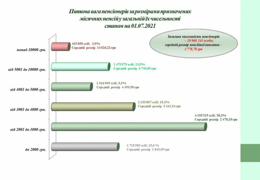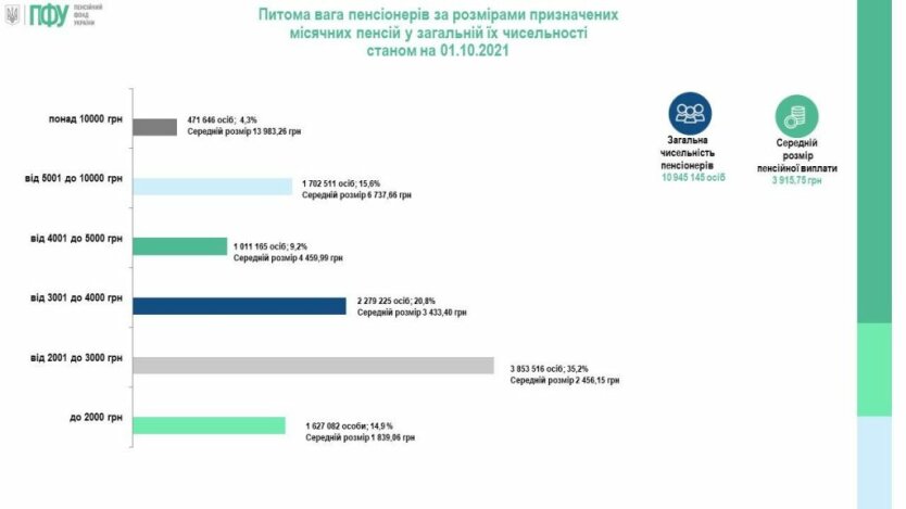 - от 3001 до 4000 грн - 20,8% (2 279 225 человек), средняя пенсия - 3 433,40 грн,