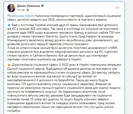 "Также в него будут включены 125 административных услуг социального характера. Впервые на практике мы реализуем принцип единого социального окна для каждого человека, удобного и лишенного коррупции", – заявил Шмыгаль.