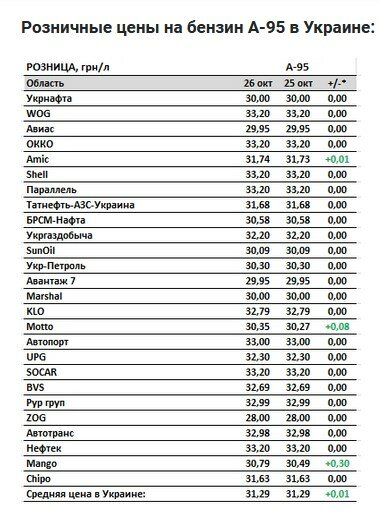 В частности, исходя из данных мониторинга, средние розничные цены на бензин А-92 составляют 30,39 гривен за литр (0,00 гривен), на бензин А-95 - 31,29 гривен за литр (прибавились в цене 0,01 гривен). Тем временем, стоимость дизельного топливо составляет 30,19 гривен за литр (плюс 0,01 гривен), а на автогаз - 18,45 гривен за литр (подорожал на 0,02 гривен).