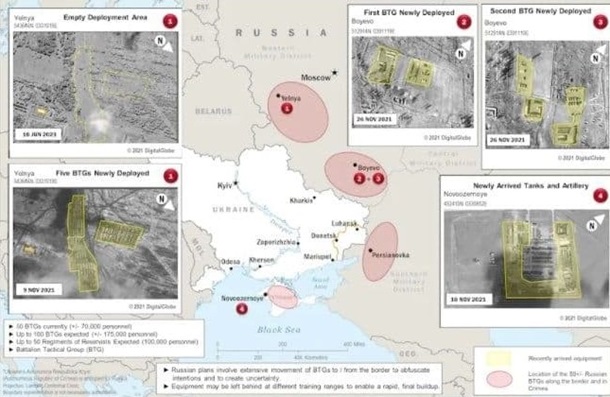 Разведчики утверждают, что батальонные тактические группы российской армии систематически перемещаются к границе и от нее "для сокрытия намерений и создания неопределенности". Кроме того, предполагается, что военное оборудование сохраняется на тренировочных объектах, чтобы в нужный момент была возможность быстро приступить к атаке на Украину.