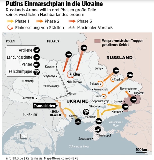 Вторжение российских войск в Украину планируется в три этапа, сообщает немецкое издание Bild со ссылкой на источник в НАТО, знакомый с данными западных разведок.