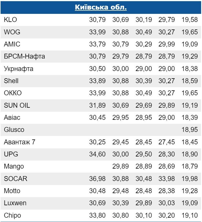 В частности, на АЗС KLO цена на бензин А95+ составляет 30,79 грн за литр, WOG предлагает за 33,99 грн/л, AMIС – 33,79 грн/л, БРСМ-Нафта – 30,79 грн/л, SOCAR – 36,98 грн/л.