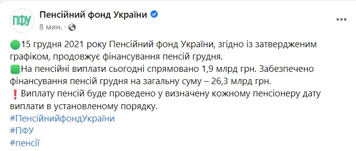 15 декабря Пенсионный фонд Украины, согласно утвержденному графику, продолжает финансирование пенсий в последнем месяце 2021 года.