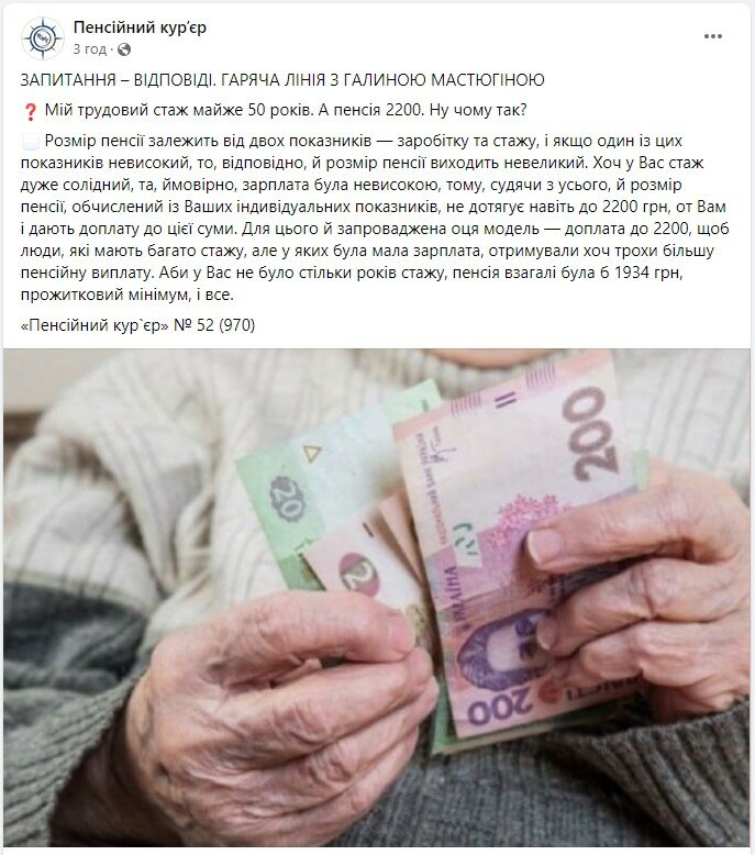 "Хотя у вас стаж очень солидный, но, вероятно, зарплата была невысокой, поэтому, судя по всему, и размер пенсии, исчисленный из ваших индивидуальных показателей, не дотягивает даже до 2200 грн, вот вам и дают доплату до этой суммы. Для этого и введена эта модель – доплата до 2200, чтобы люди, у которых много стажа, но у которых была малая зарплата, получали хоть немного большую пенсионную выплату. Если бы у Вас не было столько лет стажа, пенсия вообще была бы 1934 грн, прожиточный минимум и все", – говорится в ответе на вопрос.