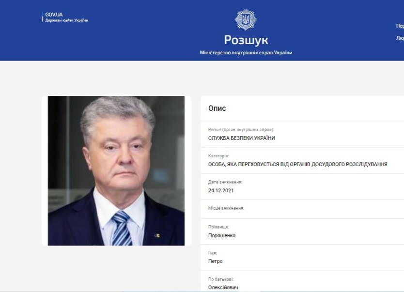 Так, в разделе "Лица, скрывающиеся от органов досудебного следствия" есть информация о Порошенко. В этот список его внесли 24 декабря 2021 года, А обновлялись последний раз в минувшую субботу, 15 января, в 7:47.