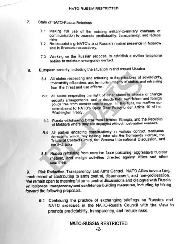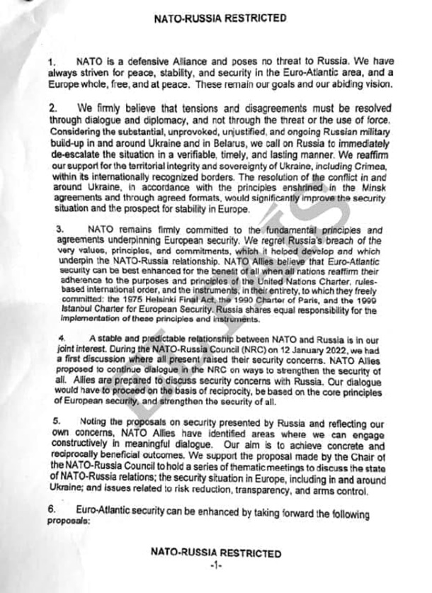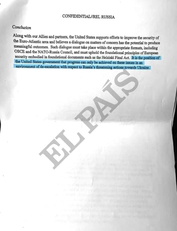 Испанское издание El Pais опубликовало документы, которые, по утверждению журналистов, являются ответом США и НАТО на предложения России по гарантиям безопасности.