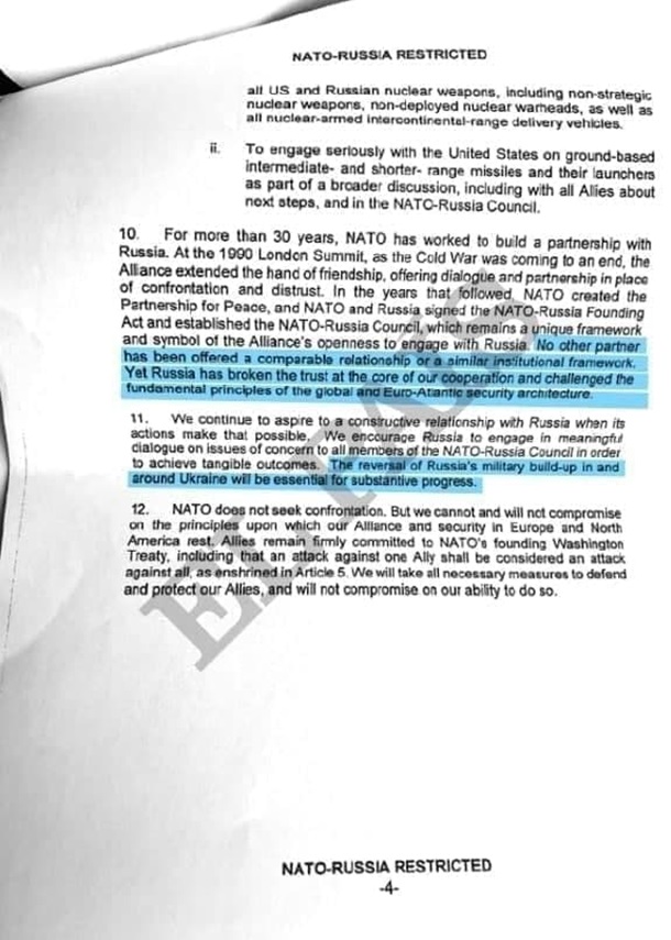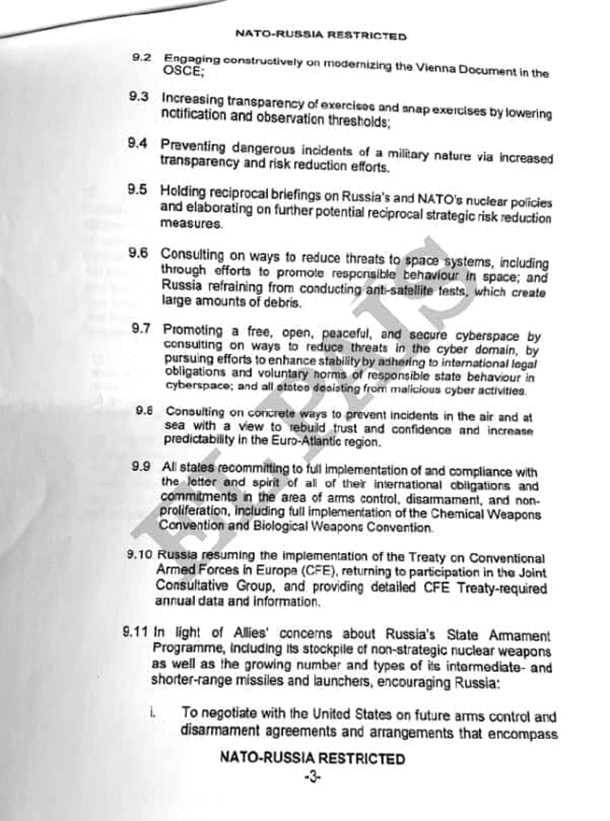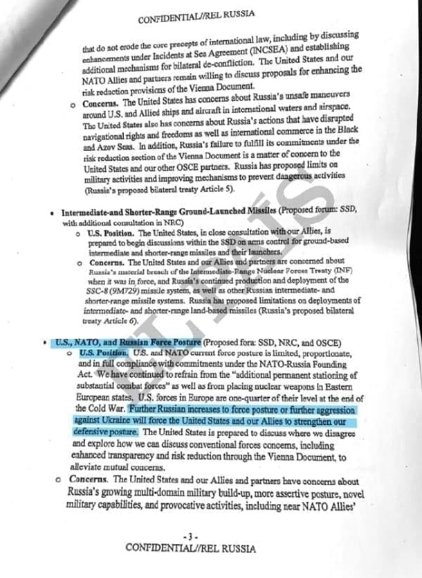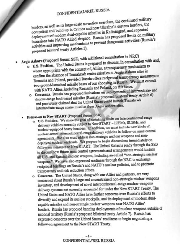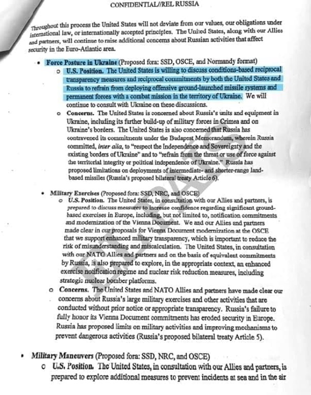Как следует из документов, США заявили о готовности начать диалог с РФ по вопросам контроля за вооружениями в сфере ракет средней и меньшей дальности, а также обсудить взаимные обязательства по ограничению развертывания наступательных ракетных систем и сил в Украине. Также США и НАТО якобы заявили РФ, что воздерживаются от размещения ядерного оружия в Восточной Европе. Кроме того утверждается, что США готовы обсудить с РФ механизм для подтверждения неразмещения крылатых ракет "томагавк" в Румынии и Польше.