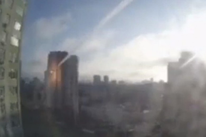 В сети появилось видео момента прямого попадания ракеты в жилую многоэтажку в Киеве утром в субботу, 26 февраля.