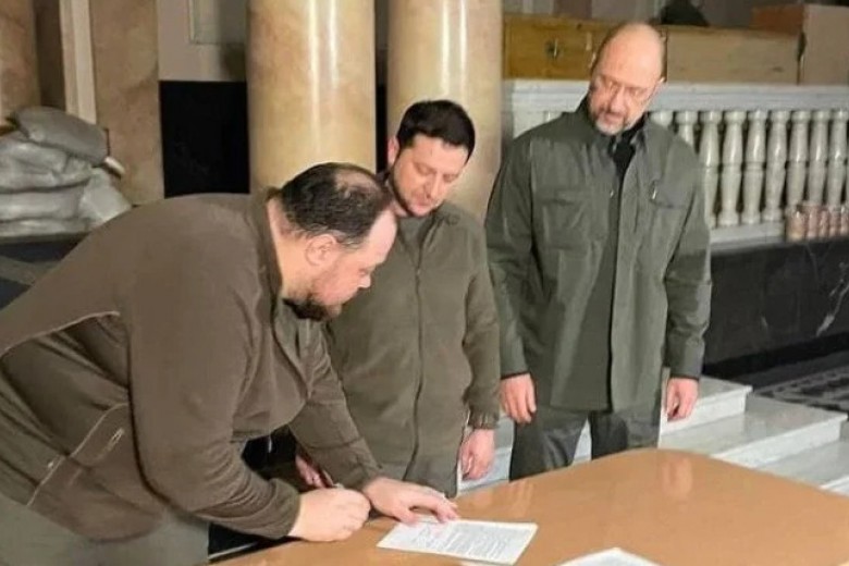 Позже пресс-служба "Слуги народа" опубликовала фото подписания документа президентом Владимиром Зеленским. На подписании присутствовали спикер Верховной Рады Руслан Стефанчук и премьер-министр Денис Шмыгаль.