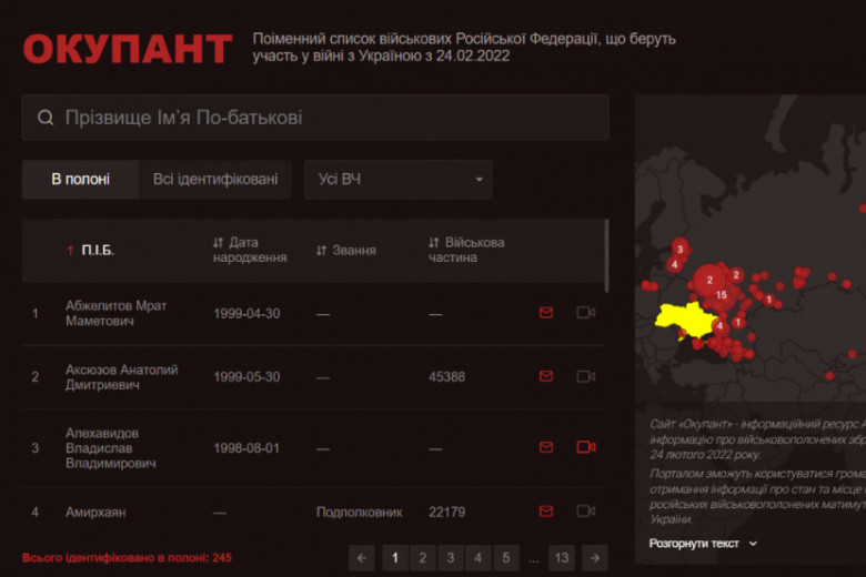 Специалисты аппарата Совета национальной безопасности и обороны Украины разработали сайт "Оккупант", который предоставляет информацию о военнопленных из вооруженных сил РФ.