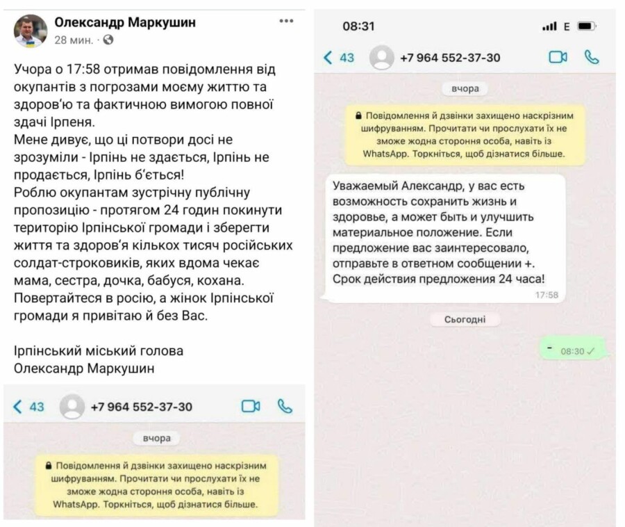 Мэр Ирпеня Александр Маркушин заявил о получении угроз от россиян в свой адрес.