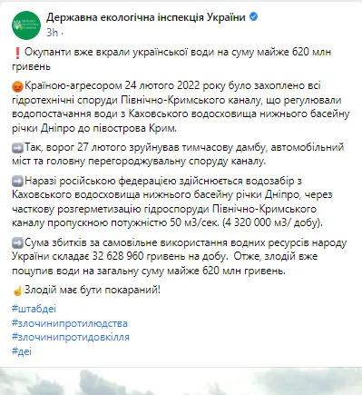 Российские оккупанты захватила все гидротехнические сооружения Северо-Крымского канала, а с 27 февраля разрушили временную дамбу и начали незаконно поставлять воду в Крым. Такими действиями захватчики уже нанесли ущерб на 620 млн грн.